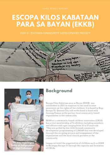 The Escopa 3 Kilos Kabataan para sa Bayan (EKKB) was established in 2015 in response to the need to raise awareness on the rights of the children. It is based in Brgy. Escopa III, Quezon City and works hand in hand with Gawang Kamay as the partner local community-based organization in the community.
